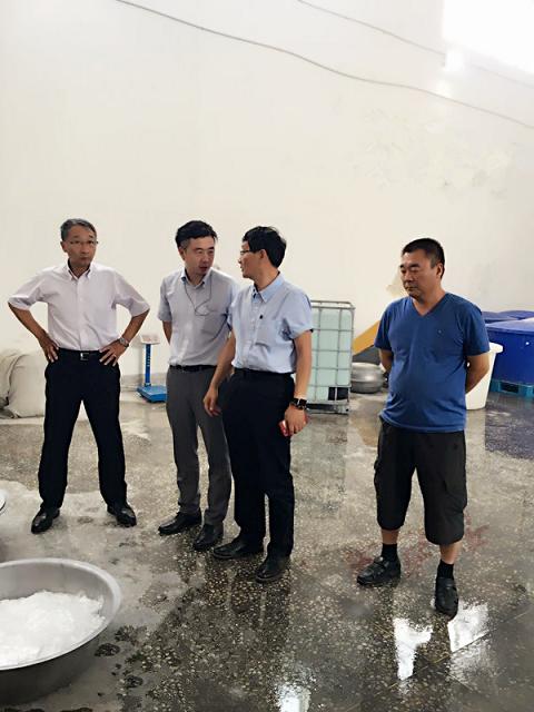 小原購買部主事絃楽峰さん(左)、盛と技師劉明鋼さん(左二)、小原會社事業部長開沼さん(中)、盛と會長靑に縄さん(右2)、盛社長と羅建民さん(右)寫真